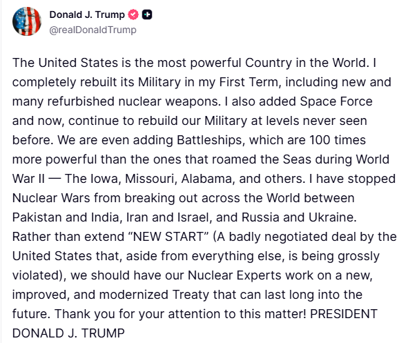 TRUMP: WE NEED A NEW NUCLEAR TREATY “Rather than extend ‘NEW START’ (A badly negotiated deal by the United States that, aside from everything else, is being grossly violated), we should have our Nuclear Experts work on a new, improved, and modernized Treaty that can last long into the future.” I agree. China is developing more nuclear weapons than the rest of the world combined, and any treaty MUST include them! Source: Truth Social