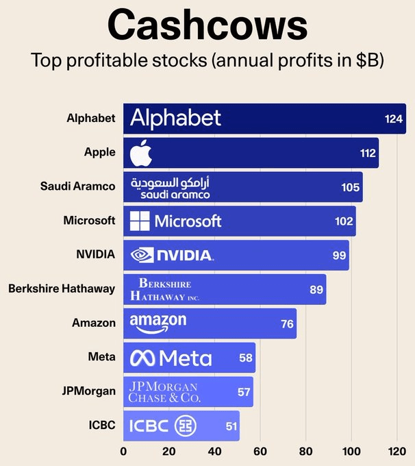 Source: Stocks World: a) Cashcows. Top profitable stocks inn the world (annual profits $B). b) US$1.5 Trillion Stock Market