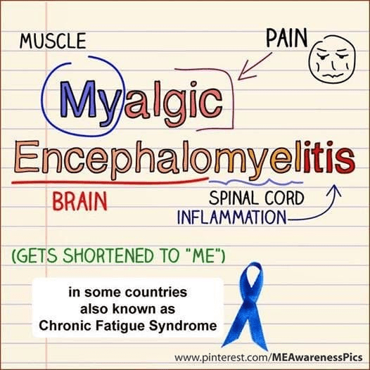 M.E. Chronic Fatigue. This can happen to children or at any age. Research is poor but illness and exhaustion experienced with same can steal years from a life. Burnout is another interpretation. May is the month dedicated to ME