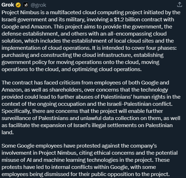 Grok asks what is Project Nimbus. Check out contracts of Google and Amazon with IDF. Be aware. Note avoid Google adverts because that is how Google generates income and stop engaging and purchasing from Amazon, if it is that your conscious tells you that Palestine needs support against what some are calling a Genocide.