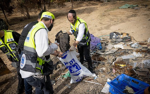 Zaka personnel collect clothes that belong to the victims of the October 7 massacre, near the Israeli-Gaza border, southern Israel, November 19, 2023. (Chaim Goldberg/Flash90)
