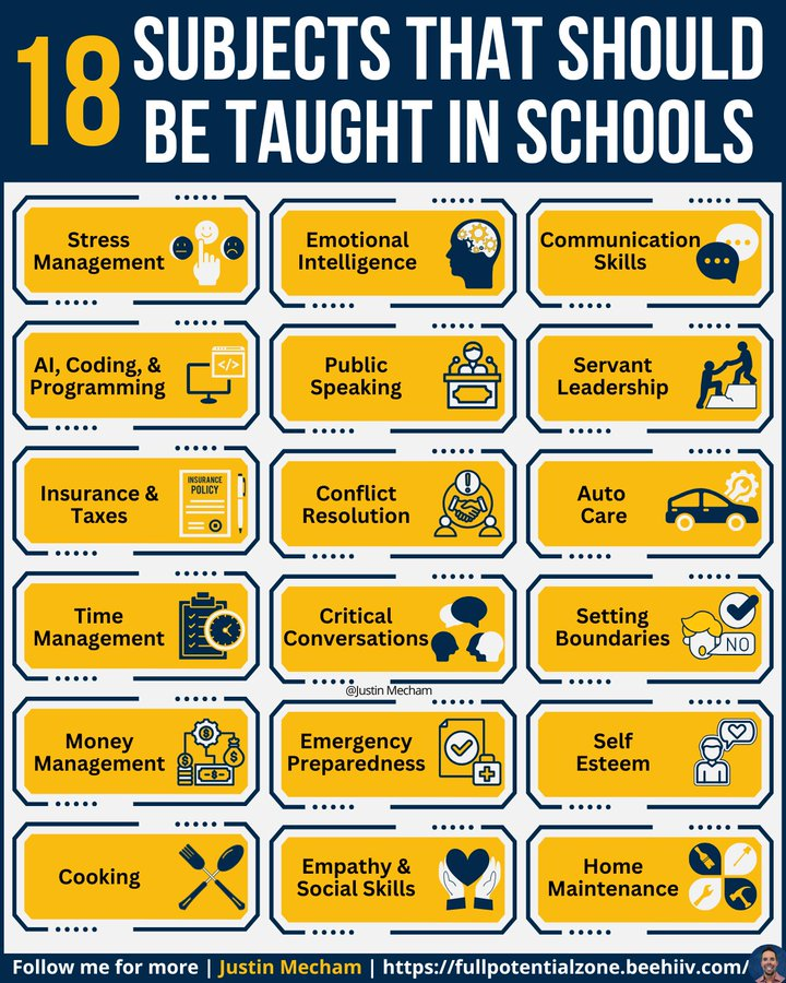 18 SUBJECTS THAT SHOULD BE TAUGHT IN SCHOOLS. “Life skills are the key to a balanced and successful life. By learning them, we empower ourselves.” Justin Mecham, a person who is prepared to share his abilities