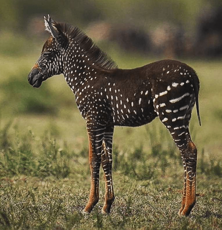 This unique foal, named “Tira” after the Maasai guide who found it, has no stripes. Instead, he has white dots on a dark brown coat, as opposed to the typical black-and-white stripes. This peculiar appearance is due to melanism, a genetic mutation affecting melanin levels in the zebra’s fur. Tira’s unusual coloration, however, comes with challenges. Unlike the iconic stripes that help zebras blend into their surroundings and confuse predators, Tira’s distinct pattern makes it stand out, increasing the risk of predation. In addition, the foal has a short, hairless tail, differing from the brush-like tail of most zebras. Tira was initially found in Masai Mara in 2019.