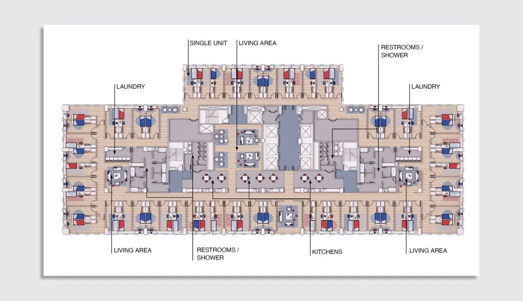 Gensler’s vision would ring the outer layer of an office floor with small, studio-style rooms with microwaves and fridges, roughly the size of a modest hotel room. The plans call for 190-square-foot units in L.A., and up to 227-square-foot units in Houston, about half the size of a typical studio apartment. The center of each floor would contain shared living rooms, kitchen, and bathrooms. These layouts would be designed with private keycard entry by floor, and what designers call a more concerted focus on safety, privacy, and security.