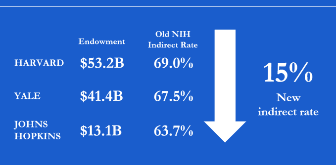 Last year, $9B of the $35B that the National Institutes of Health (NIH) granted for research was used for administrative overhead, what is known as “indirect costs.” Today, NIH lowered the maximum indirect cost rate research institutions can charge the government to 15%, above what many major foundations allow and much lower than the 60%+ that some institutions charge the government today. This change will save more than $4B a year effective immediately. Harvard — Yale — John Hopkins