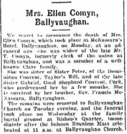 When Susan Mary Kelly was born on 9 May 1862, in Dysert, County Clare, Ireland, her father, Jeremiah Brew Kelly, was 45 and her mother, Bridget Scanlan, was 41. She married James Patrick Comyn on 22 January 1883, in Ballyvaughan, County Clare, Ireland. They were the parents of at least 6 sons and 3 daughters. She lived in Drumcreehy, County Clare, Ireland for about 10 years. She died on 3 May 1922, in Ballyvaghan, Drumcreehy, Co. Clare