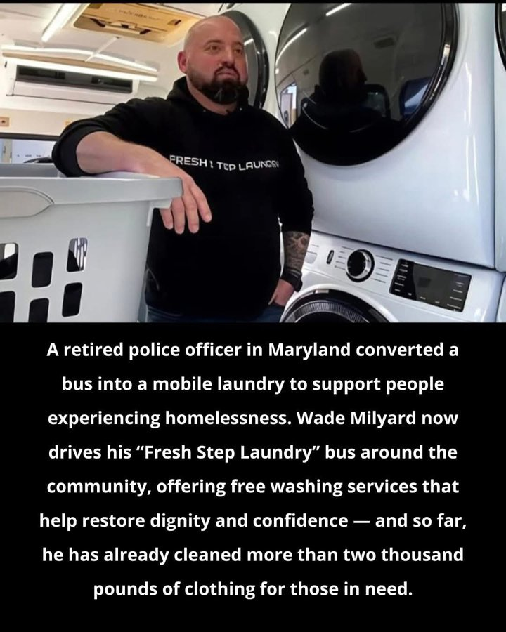 A retired police officer in Maryland converted a bus into a mobile laundry to support people experiencing homelessness. Wade Milyard now drives his “Fresh Step Laundry” bus around the community, offering free washing services that restore dignity and comfort — and he’s already cleaned more than two thousand pounds of clothing for those in need. Humanity still exists