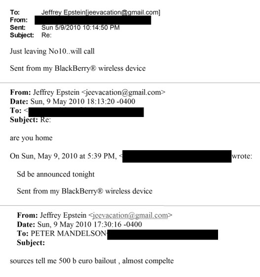 * Mandelson also gave Epstein advance notice of a €500billion bailout of the Eurozone – he emailed him then spoke to him about it on eve of the announcement