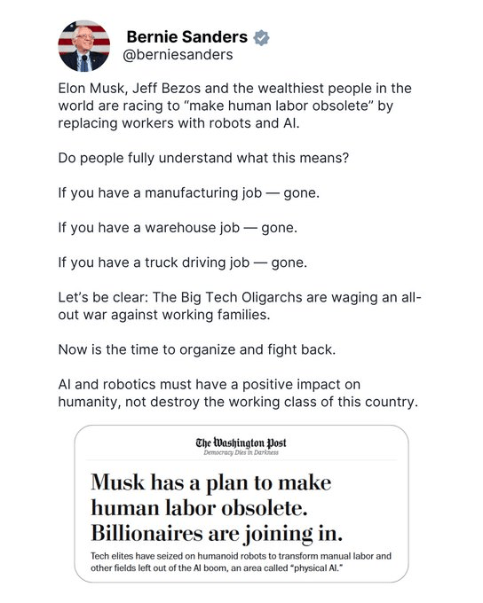 Bernie Sanders: “make human labor obsolete” ie replacing workers with robots and AI