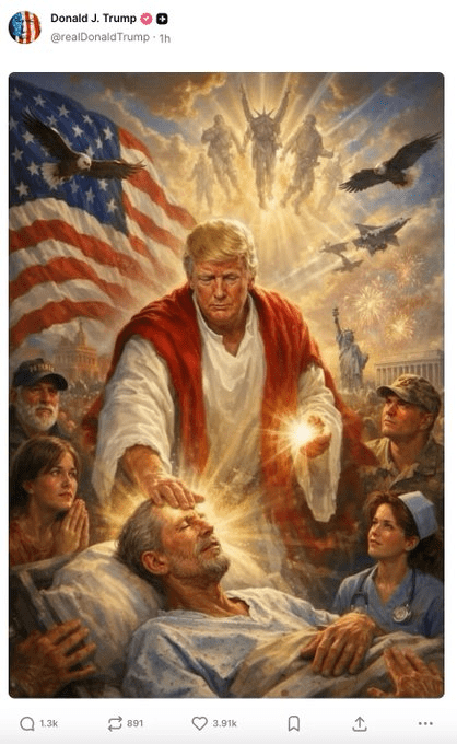 President Trump has posted this picture on social media of himself as Christ healing the sick. I’ve long given up saying how hard it is to think of any previous US president who behaved like Donald Trump, but comparing himself to Jesus puts him on another level altogether.