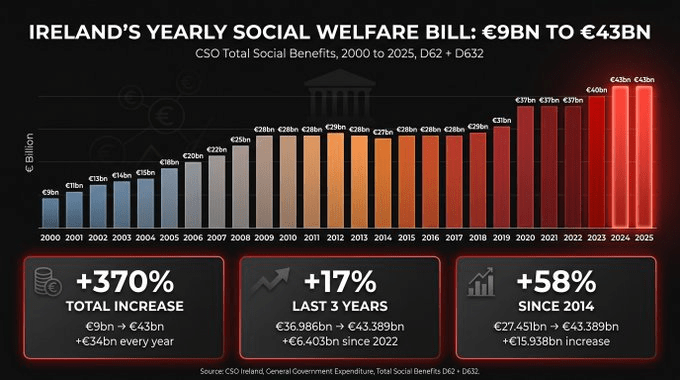 Government released detailed expenditure data today. Ireland’s yearly social welfare bill has exploded from €9bn to €43bn. That is a €34bn increase and a 370% surge. Even in the last 3 years alone it is up €6.4bn. This is completely out of control.