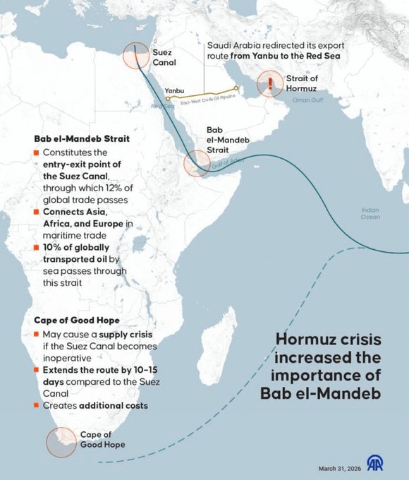 Hormuz is blocked. So everyone rerouted through Bab el-Mandeb.