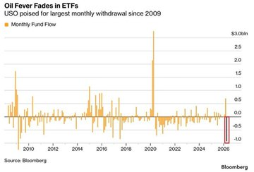 Oil investors are cashing out at the fastest pace in 17 years. $USO is up +91% year-to-date, one of its best runs this century. But April has seen -$900 million in outflows, putting it on track for its largest monthly withdrawal since 2009’s -$1.2 billion record. The trade ran +100% from January to early April. Now the early winners are walking out the door. When the smartest money in a trade starts leaving at record speed, the rest of the market should pay attention. Source: Bloomberg